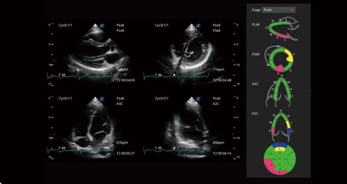 Eine unkomplizierte Vorlage für Kliniker, die mehrere dynamische Bilder in Ruhe und nach Belastung aufnehmen und nebeneinander vergleichen können. Für eine weitergehende effektive Abklärung der Vitalität des Herzmuskels werden professionelle Scores und Berichte zur Wandbewegung bereitgestellt.