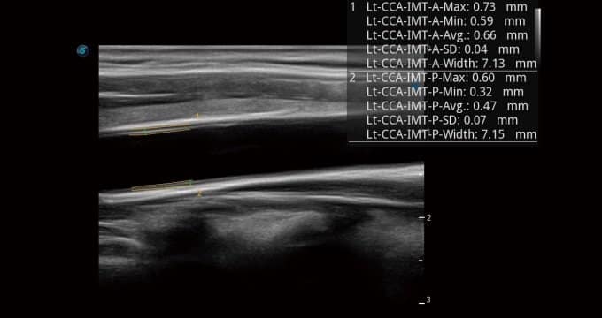 Auto IMT ist ein intelligentes Instrument zur Analyse des potenziellen Risikos eines Patienten für Herz-Kreislauf-Erkrankungen. Durch Anklicken einer Schaltfläche können Sie sowohl die Intima-Media-Dicke sowohl der Vorder- als auch Hinterwand der A.carotis communis messen. Dieses einfache Verfahren steigert die Produktivität der Untersuchung und erhöht ihre diagnostische Aussagekraft.