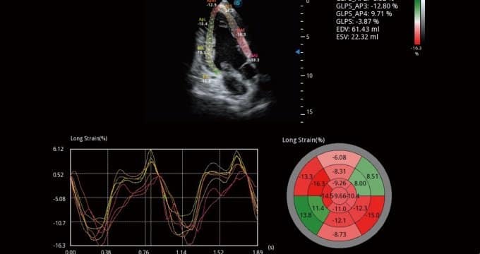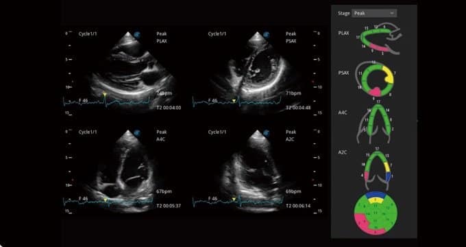 MQA bietet eine präzise quantitative Messung der Myokardmechanik anhand einer empfindlichen Echtzeit-Verfolgung der Wandbewegung. Die Funktion erlaubt eine globale und regionale Abklärung einschließlich Dehnung, Dehnungsrate, Auslenkung, Geschwindigkeit usw.