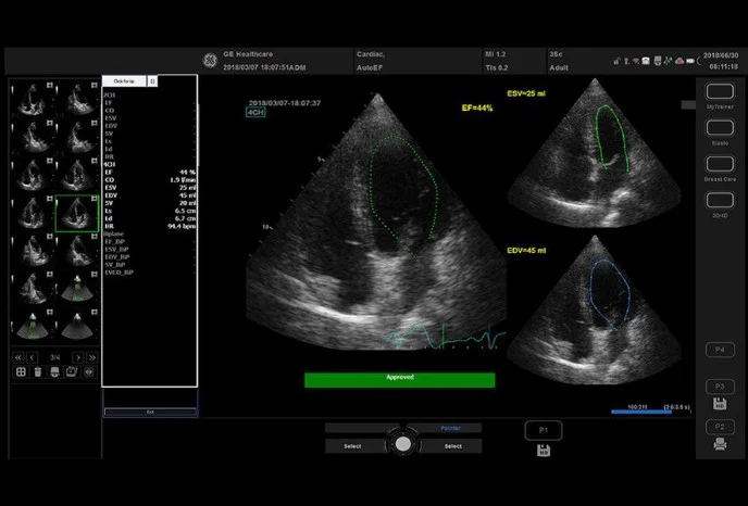 Halbautomatisches Tool zur Messung der globalen Ejektionsfraktion. Verfolgt und berechnet die Verformung des Myokardgewebes basierend auf der Merkmalsverfolgung auf B-Mode-Cine-Loops mit EKG. Wird auf einer oder beiden apikalen 4-Kammer- und/oder 2-Kammer-Ansichten durchgeführt. Kann die Endokardgrenze (EB), den halbautomatischen Auto-ROI und den halbautomatischen 3-Punkt-EB-Definitionsmodus neu berechnen/neu zeichnen.