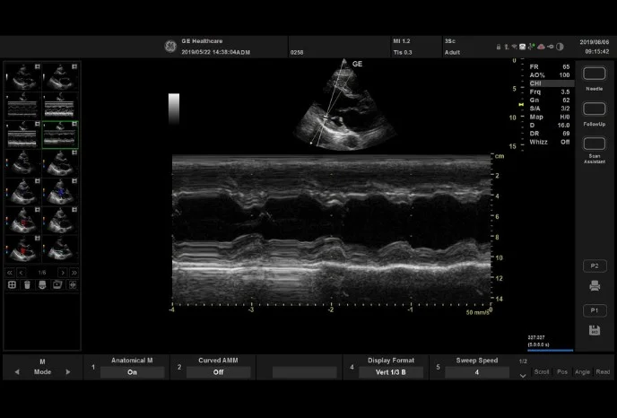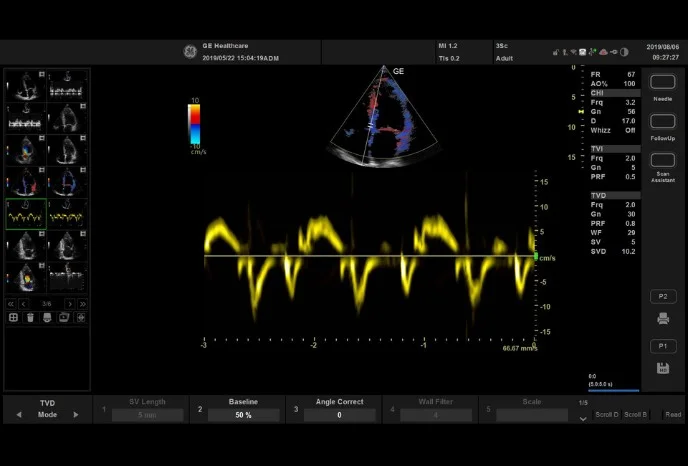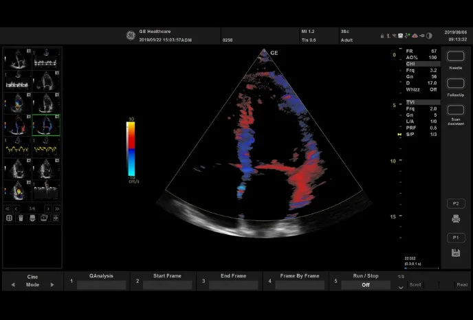 Tissue Velocity Imaging (TVI) berechnet die Geschwindigkeiten im Gewebe und kodiert sie farblich. Quantitative Analyse (Q-Analyse): Ermöglicht Benutzern die Anzeige mehrerer Zeitbewegungsspuren von ausgewählten Punkten im Myokard. Verfügbar mit der 3Sc-RS-Sonde.