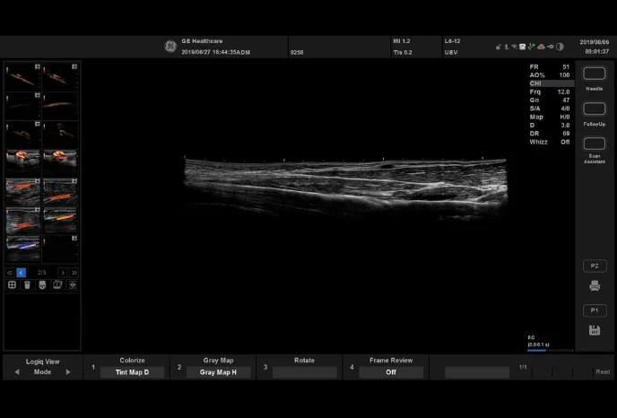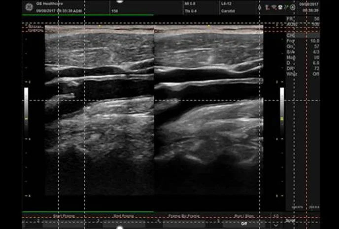 Auto IMT berechnet automatisch die Intima-Media-Dicke der Gefäße. Platzieren Sie einfach die Sonde am Hals des Patienten, lokalisieren Sie die Halsschlagader und finden Sie die richtige Ebene für einen Längsschnitt. Wählen Sie dann das IMT-Messpaket aus, platzieren Sie den Cursor und das Versana-System liefert eine Messung – möglicherweise konsistenter als eine manuelle Messung.