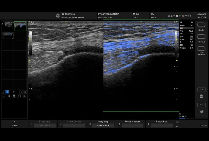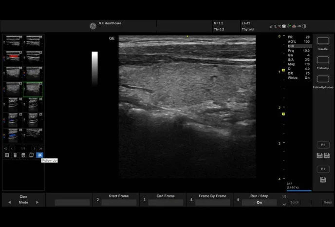 Das Follow-up-Tool ermöglicht die Referenzierung eines vorherigen Scans im Vergleich zum aktuellen Live-Scan. Gleiche Parameter des vorherigen Bildes werden mit dem Livebild überlagert. Mit Follow-up Fusion können Benutzer die knöchernen Orientierungspunkte oder Faszienebenen mit der Überlagerung ausrichten, um anhand einer Vergleichsstudie die gleiche Scanposition zu finden. Verbesserung des Arbeitsablaufs durch Eliminierung von Parameteranpassungen, um dieselben Scanbilder zu erhalten – bringt den Fokus wieder auf die Patienten.