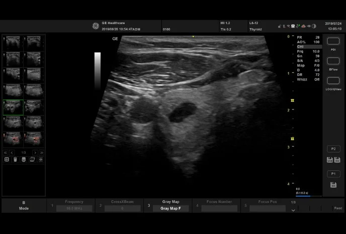 High-Definition Speckle Reduction Imaging (SRI-HD) bekämpft Speckle, indem es kleine Bereiche des Bildes analysiert, um festzustellen, ob sie hauptsächlich Speckle oder hauptsächlich anatomische Merkmale enthalten, und sie dann entsprechend verarbeitet. Die Merkmale werden verbessert, was zu helleren, kontinuierlicheren Grenzen führt. Durch die Glättung des Speckles sind Variationen in der Echogenität verschiedener Geweberegionen leichter zu erkennen, da die Augen des Benutzers nicht durch die Speckle-Variationen abgelenkt werden. SRI-HD verbessert die Details und behält gleichzeitig die Bildintegrität bei.