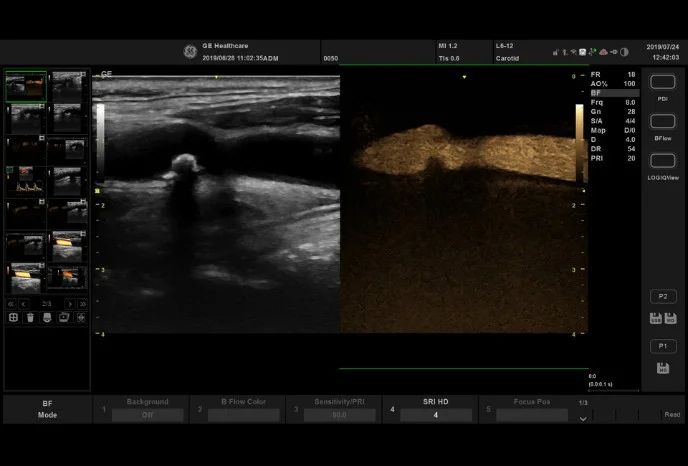 Mit B-Flow™ und B-Flow-Farb-Bildgebung lassen sich zur Analyse des Blutflusses und der Erkennung von Unregelmäßigkeiten an der Gefäßwand sowie Gefäß-Verengungen besser darstellen.