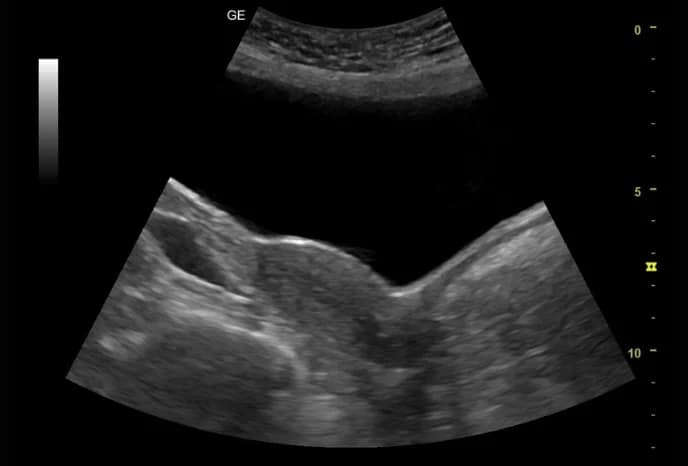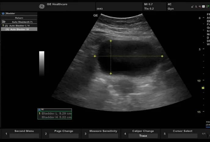 Mit Auto Bladder können Sie eine Region of Interest (ROI) über der Blase zeichnen und automatische Volumenberechnungen durchführen. Auto Bladder Volume misst automatisch das Blasenvolumen. Die Hauptanwendung besteht darin, drei längste orthogonale Linien (L, H und W) aus zwei Blasenschnitten zu messen.
