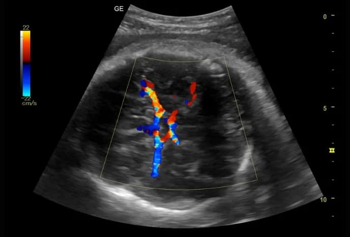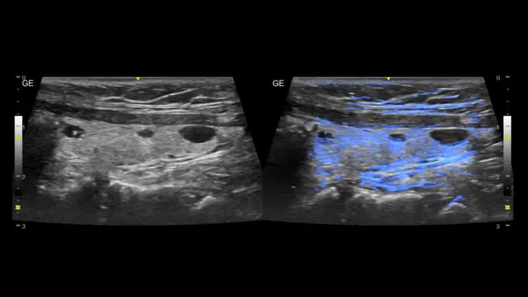 Mit B-Flow™ und B-Flow-Farb-Bildgebung lassen sich zur Analyse des Blutflusses und der Erkennung von Unregelmäßigkeiten an der Gefäßwand sowie Gefäß-Verengungen besser darstellen.