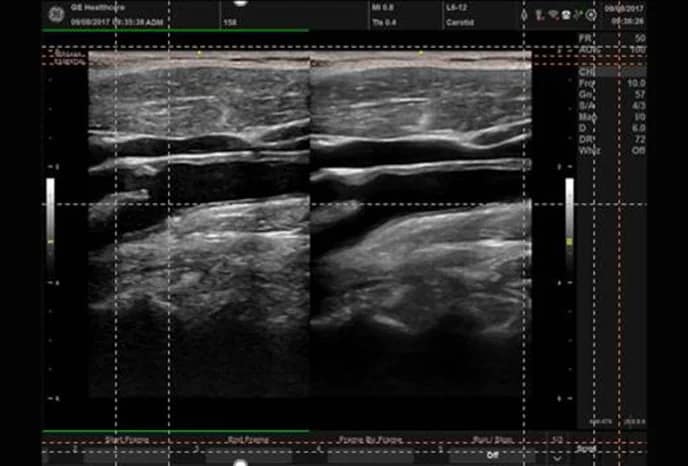 Auto IMT berechnet automatisch die Intima-Media-Dicke der Gefäße. Platzieren Sie einfach die Sonde am Hals des Patienten, lokalisieren Sie die Halsschlagader und finden Sie die richtige Ebene für einen Längsschnitt. Wählen Sie dann das IMT-Messpaket aus, platzieren Sie den Cursor und das Versana-System liefert eine Messung – möglicherweise konsistenter als eine manuelle Messung.