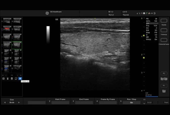 Das Follow-up-Tool ermöglicht die Referenzierung eines vorherigen Scans im Vergleich zum aktuellen Live-Scan. Gleiche Parameter des vorherigen Bildes werden mit dem Livebild überlagert. Mit Follow-up Fusion können Benutzer die knöchernen Orientierungspunkte oder Faszienebenen mit der Überlagerung ausrichten, um anhand einer Vergleichsstudie die gleiche Scanposition zu finden. Verbesserung des Arbeitsablaufs durch Eliminierung von Parameteranpassungen, um dieselben Scanbilder zu erhalten – bringt den Fokus wieder auf die Patienten.