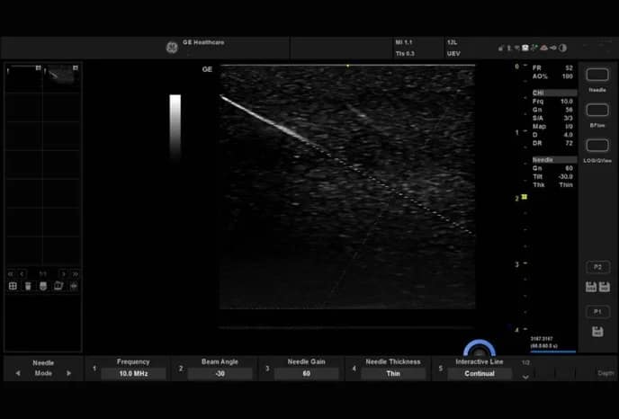 Mit dieser Funktion können Sie genaue Biopsien mit einer Technologie durchführen, die die genaue Position der Nadelspitze klärt. Es zeigt die Struktur einer Nadel innerhalb der Anatomie, ohne dass die Nadel verformt wird. Es bietet eine bessere Visualisierung der Biopsienadel als der normale B-Modus mit gesteuertem Strahlwinkel und Nachbearbeitung. Die Nadelerkennungsfunktion ist mit linearen Sonden (12L-RS, 9L-RS, L6-12-RS, L3-12-RS) und konvexen Sonden (4C-RS, C1-5-RS) verfügbar.