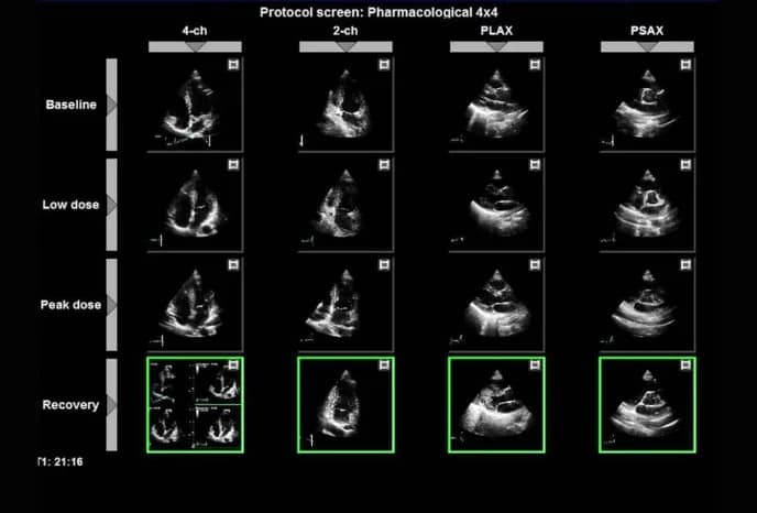 Mit dem integrierten Stress-Echo-Paket haben Sie die Möglichkeit, Bilderfassung, Überprüfung, Bildoptimierung, Wandsegmentbewertung und Berichterstellung für eine vollständige, effiziente Stress-Echo-Untersuchung durchzuführen. Zu den Protokollvorlagen gehören: Übung, Pharmakologie, Workflow anpassen, 2D/TVI-Analyse, Segmentbewertung und Segmentvergleich.
