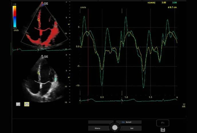 Tissue Velocity Imaging (TVI) berechnet die Geschwindigkeiten im Gewebe und kodiert sie farblich. Quantitative Analyse (Q-Analyse): Ermöglicht Benutzern die Anzeige mehrerer Zeitbewegungsspuren von ausgewählten Punkten im Myokard. Verfügbar mit der 3Sc-RS-Sonde.